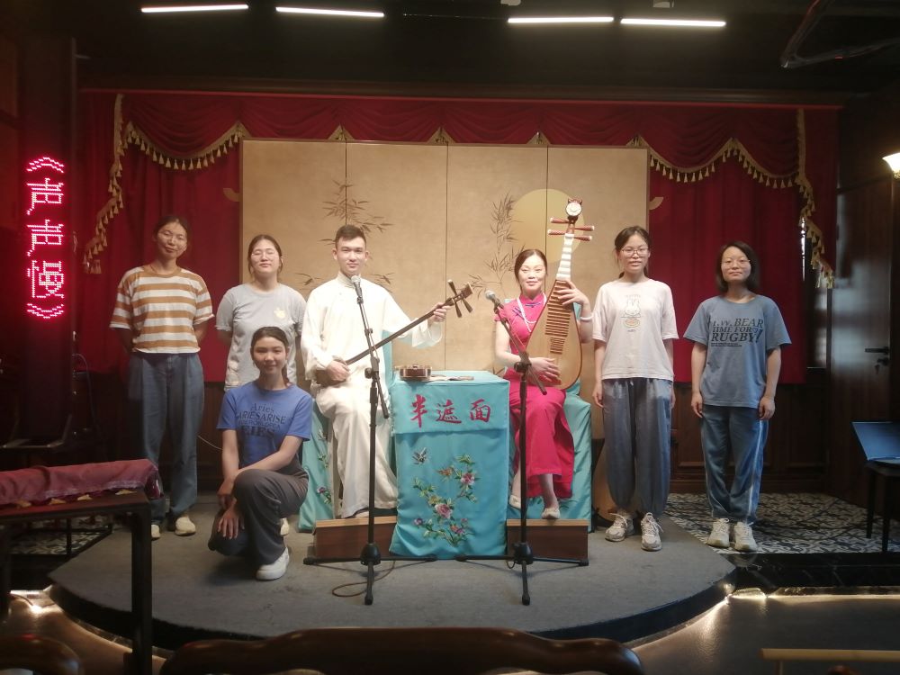 除此之外,朱怡女士还分享了自己与评弹的故事。从生发兴趣到拜师学艺,从初出茅庐到炉火纯青,她与评弹始终相伴,融为一体。朱怡女士的故事使调研队员们深受感动,感受到评弹艺术在现代社会中的传播和推广的重要性,也为继续深入调研苏州评弹注入了强劲的动力。
