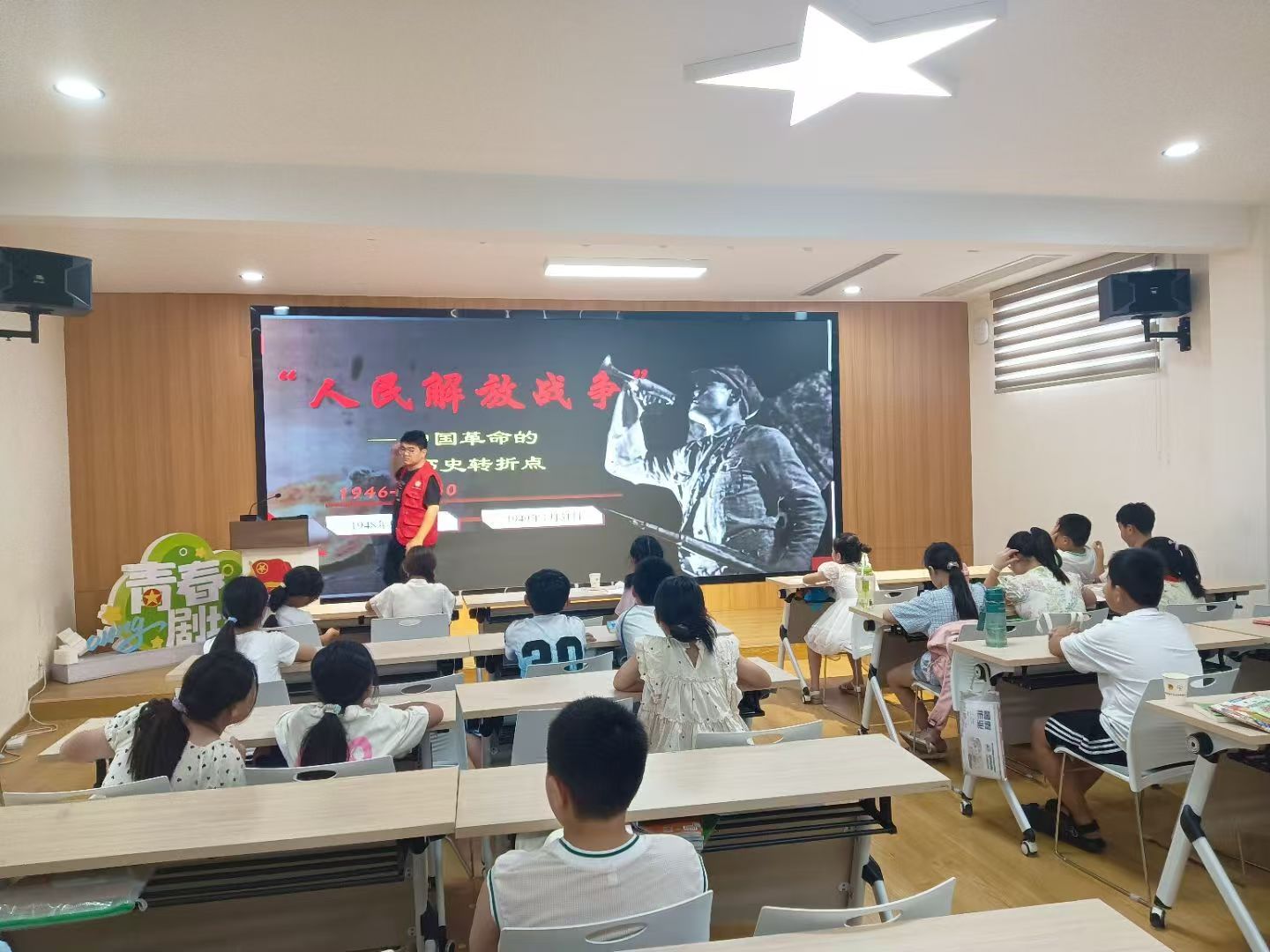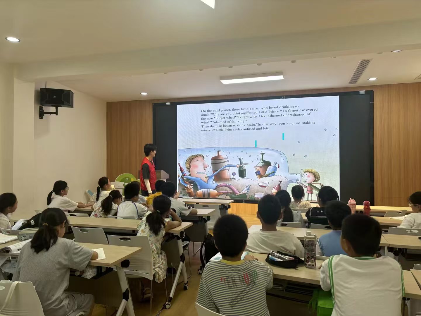 英语故事课堂上,志愿者以经典英文故事为载体,用生动的讲述、趣味互动,带孩子们走进奇妙的英语世界。大屏幕上,《小王子》的英文片段搭配童趣插画,志愿者用易懂的英语、活泼的肢体动作,拆解故事里的词汇与情节。从单词学习,到探讨故事中 “不断犯错” 的寓意,孩子们睁大眼睛,专注聆听、积极回应,在沉浸式体验中,既提升了英语听说能力,又接触到文学、哲理知识。