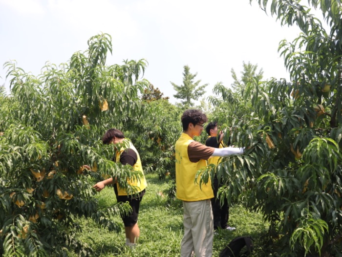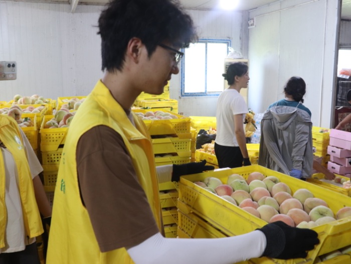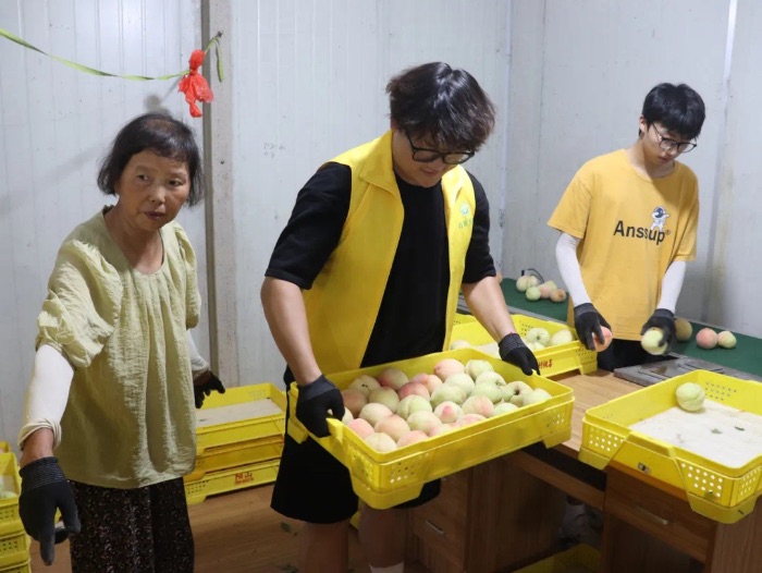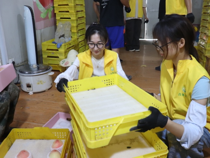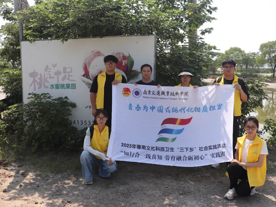 实践团队成员与桃园负责人及当地果农进行深入交流,调研水蜜桃等特色农产品的情况。“桃气十足”桃子种植基地位于江宁区徐慕村,占地200余亩,以阳山水蜜桃等优质品种为主,坚持多品种、有机化种植,专业果农精心管理,年产量达20万袋,产品主要销往无锡等地区。果园深化与当地农村合作,加入农村种植合作社,有效带动了农民增收与区域经济发展。 为更真切地了解一线生产实况,团队成员深入果园、生产车间,亲身体验了从采摘、分拣、包装到运输的完整劳作流程。 v 此次“三下乡”暑期社会实践活动,远不止于一场调研。这份“田间课堂”的淬炼,不仅深化了学子们对农业产业链的理解,锤炼了吃苦耐劳的意志品质,提高了学生的劳动精神和劳动能力,更在“知行合一”中厚植了服务乡村振兴的赤子情怀。
