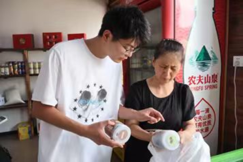 图为土特产店老板向团队成员介绍当地农户自产山核桃产品时的场景。