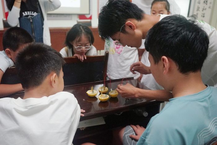 柠檬发电,玩转科学。科普环节后,实践团带领同学们动手进行柠檬发电实验。成员们提前准备好材料,耐心指导大家按步骤操作。当看到小灯泡在柠檬的“驱动”下亮起时,同学们纷纷发出惊叹。实践团成员趁机讲解原电池的工作原理,让抽象的科学知识在趣味实验中变得易懂。
