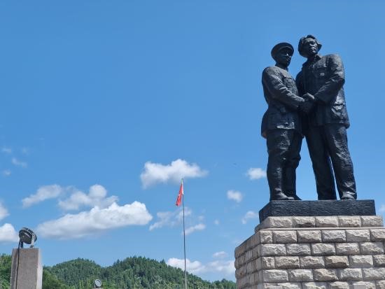 一程山路,一曲赞歌。实践团顺抵达朱毛会师广场。巍峨纪念碑前,师生肃立。矗立于广场中央的朱毛会师雕像,以苍劲雄浑的线条,铭刻下朱毛会师历史场景——两位伟人巍然屹立,目光如炬,穿透历史烟云,双手紧握,传递着信念与力量,诉说着革命理想的磅礴。“这一幕,不仅是往昔峥嵘的永恒定格,更是一部以磐石书写的宣言,昭示着道路选择的正确;这一幕,早已超越了物理的联结,化为永不褪色的精神印记——团结、奋斗与必胜的信念。”实践团成员王诗语如是说。热风猎猎,红旗之下,团队成员齐诵团队宣言,声震林樾,团队成员的信仰亦更加坚定。