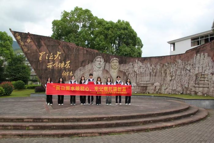 (图为服务队成员开展暑期“三下乡”出征仪式) 参观交流:追溯红色足迹,感悟初心使命实践团队在指导老师的带领下,首站深入古田会议会址及纪念馆,开启红色志愿服务之旅。在古田会议旧址前,团员青年们在团旗下庄严宣誓,重温入团誓词,铮铮誓言回荡在古厝上空,与革命先辈“思想建党、政治建军”的初心形成跨越时空的对话,这不仅是对历史的回望,更是对爱国初心的坚守。