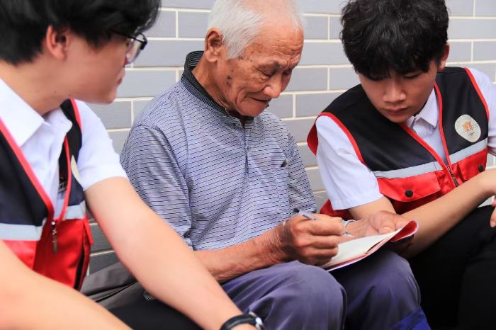 (图为服务队成员倾听廖开华老人讲述峥嵘岁月)