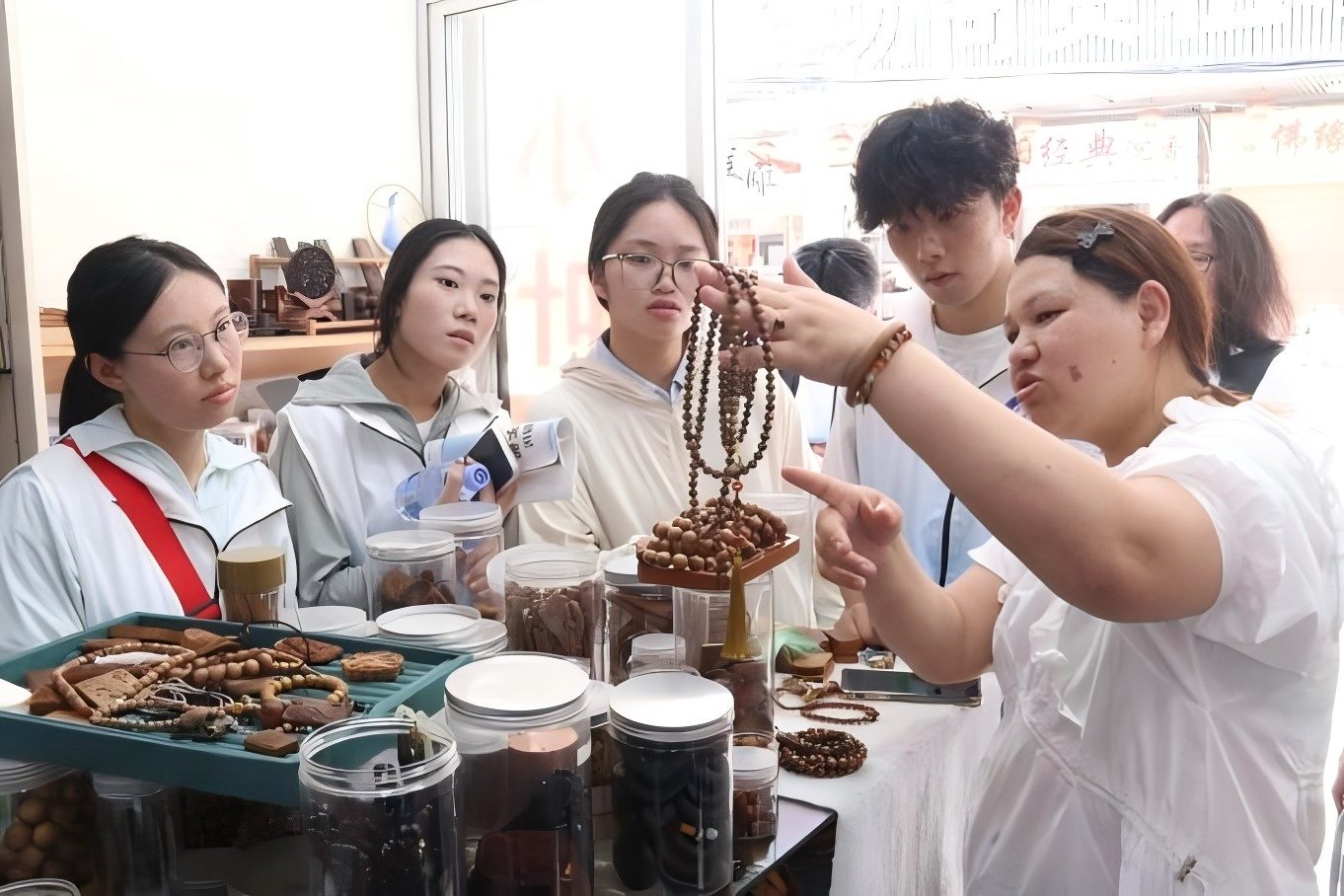 2025年6月27日,实践队抵达榜头镇工艺品一条街,深入体验传统榫卯技艺与手工精修的匠心传承。他们穿梭于不同风格的作坊,仔细观察雕刻、打磨等工艺流程,对比传统工坊与现代工坊的工艺模式差异;通过沉浸式体验,让队员们对传统工艺制作有了更立体的认识,也为探索非遗技艺的创新发展积累了宝贵的经验。