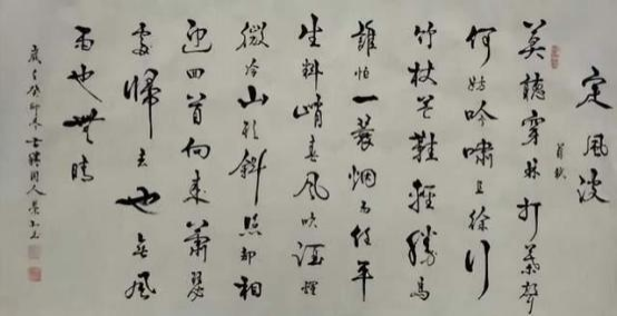 郑荣北先生的书法风格独特,他自幼临诸家名帖,基础牢固,师古不泥,形成了自己独特的书写 风格。他的行草书法远师晋代文人书法的天质自然,后学怀素书法的妙于瘦,亦有张旭书法的妙于肥 , 刚柔相济,铁点银钩。在锋纤往来之际,可以把书法写得高低有趣,丰神多姿,极具艺术魅力。