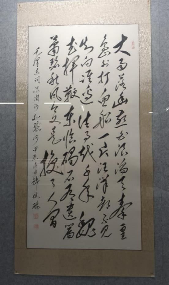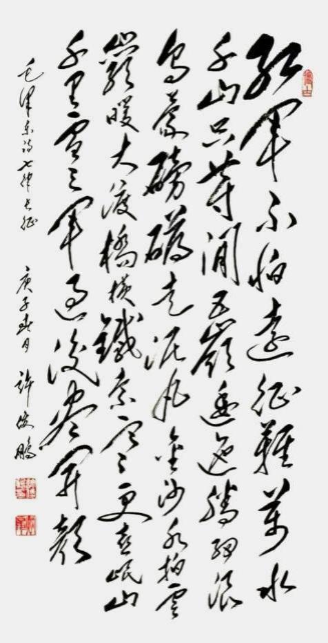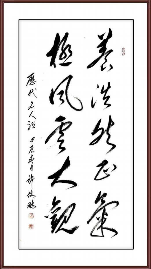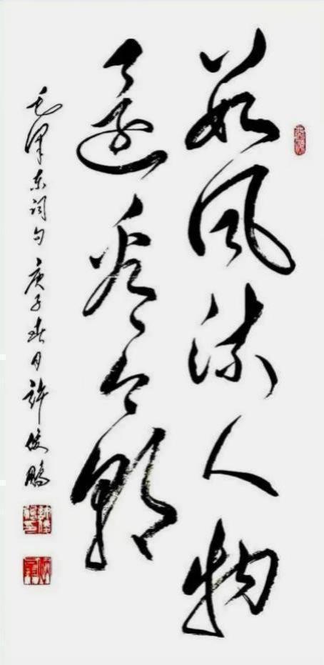 笔作飘风骤雨,墨写落花飞雪。观赏书法品味人生,在许俊鹏先生的许体草书里一件一件品读,从《龙》书天下的精气神,看到《紫气东来》的文化魅力,还有磅礴的《毛泽东诗词》,感觉他的书法作品切准了当代审美的主流脉搏,拥有可以装饰万家屏障的新力量。草书曾经以“少数人”为观赏对象,这是草书文化影响力需要打破的边界。当下,在家居厅堂、文化展馆、机关机构、风景名胜等等地方都可以发现许俊鹏题写的草书作品,感到他的书法格局已经完全打破了草书面向“少数人”的旧有边界,成为当代所有书法艺术审美者都可以一睹为快的时代文化。书法创作有许派之创新,文化弘扬有时代之功勋,当代草圣许体为功,艺术丰碑贤家确立!