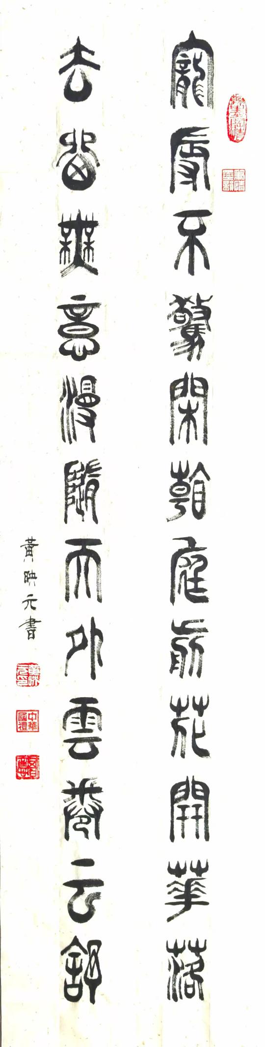 黄映元先生自幼喜爱书画艺术,9岁开始习字,先楷行后隶篆,到专攻篆书一体。他的篆书创作以中华文化、中国文字和中国书法的综合研习为基础,以中华文化的审美思想为创意,集古今书体精华于一体,自成风格,独树一帜。他本人多次被国外艺术机构邀请参加国际文化艺术交流活动,作品先后在新加坡、马来西亚、韩国等东南亚国家和法国、匈牙利、俄罗斯等欧洲多国展出和交流。2005年参加文化部组织的中国硬笔书法协会代表团,在新加坡、马来西亚、韩国等东南亚国家的国际文化交流活动,展出的篆书作品在国外倍受华人喜爱,被多位外国政要和友好人士收藏。2006年作品荣获第一届国际书画艺术大奖赛“荣誉金奖”。2007年作品荣获“和平女神杯”首届国际书画大展赛“和平奖”。2008年作品荣获“中华杯”全国书画大奖赛“金奖”。2009年参加中国文化艺术交流展在欧洲多国展出和交流,荣获“中欧文化艺术特使”和作品“金奖”。2010年作品入选中国上海世博会国礼采购作品。2011年作品入选中国国礼献礼奥地利国庆活动。2014年作品《论语选句》被人民大会堂收藏。2015年在北京国粹园文化艺术交流中心举办个人作品展览,接受中央电视台《魅力故乡》栏目组专题采访。2016年参加中韩文化艺术交流,作品在韩国釜山和首尔展出,展览作品被中韩日交流协会和韩国外交部收藏。2016年作品《论语选句》被中南海国礼中心收藏;作品《孔子论语》被镌刻在北京八达岭新长城,荣获“中国长城文化奖”。2017年作品入选全国书画名家邀请展在北京保利国际会展中心展出;作品入展“一带一路”全国书画大展在中国国家画院国展美术中心展出。2018年作品入展亚洲博鳌全国首届传统文化论坛在亚洲博鳌论坛展出。2019年作品《沁园春.雪》被国家外交部收藏;作品入编中央美术学院《中国高等美术院校教学范本》;作品《厚德载物》入选庆祝中华人民共和国成立70周年“国礼玉璧”文化图案,个人荣获庆祝中华人民共和国成立70周年“特殊贡献奖”和国庆阅兵“授阅纪念章”。2020年作品毛泽东词《沁园春.雪》先后被中国国家博物馆和中国美术馆收藏。2021年作品在匈牙利国会大厦展出。2022年作品入选中国邮政《一带一路首届中欧艺术邮票鉴藏年》邮票图案。2023年作品入编《中国书法教育名师名作教学范本》个人专集;作品毛泽东词巜沁园春 . 雪》被人民大会堂再次收藏;参加中央电视台特邀艺术代表“助力乡村振兴全国巡回”公益活动并捐献作品。2024年个人被应邀参加在韩国首尔举办的世界艺术博览会,展览作品被韩国美术馆和韩国企业家收藏;在第33届法国巴黎奥运会上个人入选中国艺术代表,作品在法国巴黎欧洲画廊展出;作品和个人艺术简历先后被《中国名人辞典》、《中国国宝档案》和《世界美术教育史》等艺术典集收录。2025年1月应邀参加在北京人民大会堂举办的“中国.东盟国际文化交流活动和中国国际教育电视台“2025新春大联欢节目录制”,荣获“国际文化交流使者”和作品“金奖〞荣誉。2025年10月应邀参加“丝路艺韵”国际艺术访问,在俄罗斯圣彼得堡美术协会、列宾美术学院和莫斯科大学进行了作品展览、艺术交流和作品捐赠,代表中国艺术访问团分别向圣彼得堡美术协会、列宾美术学院和莫斯科大学捐赠诗书作品《游览圣彼得堡》、《观列宾美院》和《眺望莫大主楼》,荣获俄罗斯列宾美院颁发的列宾艺术勋章和《国际艺术收藏证书》。2025年12月被《人民日报》以《国之脊梁一一专访民族伟大复兴功勋模范人物.黄映元》为标题,特别报道了个人艺术简历、艺术文章和篆书作品。2026年1月作品《上善若水》荣获法国卢浮宫国际艺术展铁塔奖金奖。