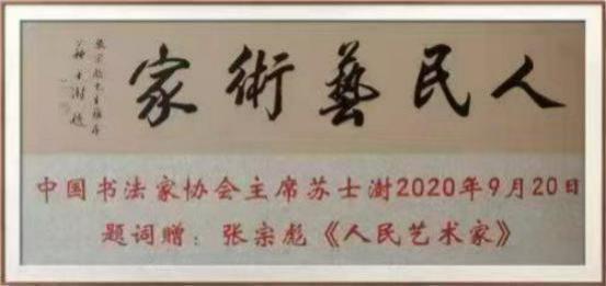 2020 年 9 月 24 日中国书法家协会主席苏士澍题词赠《人民艺术家》张宗彪。